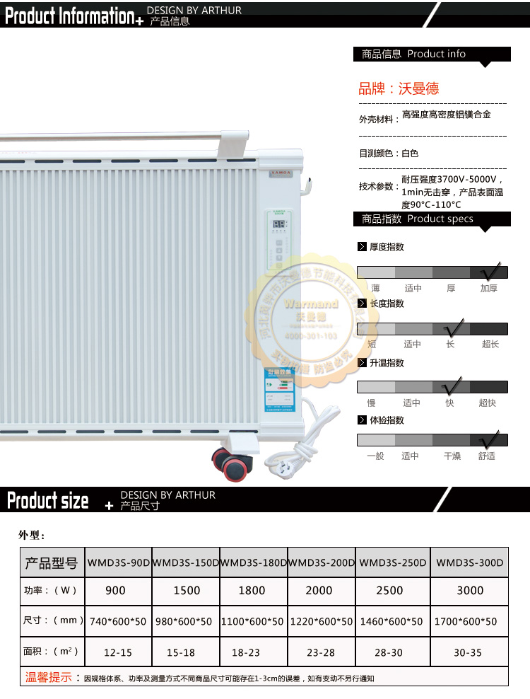 沃曼德碳晶電曖器,分為壁掛式、地暖式,功率從900-1500W,造型美觀大方、結(jié)構(gòu)堅固耐用,