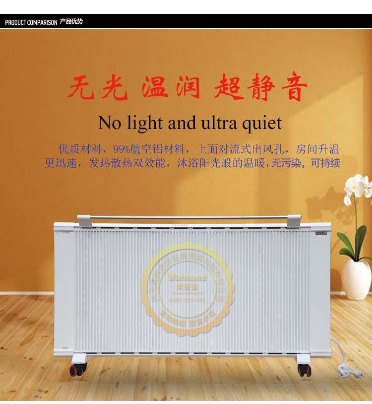 優(yōu)勢二:舒適!碳晶遠(yuǎn)紅外電暖器使用中無“小太陽”光照污染問題,無空調(diào)或者熱風(fēng)機(jī)噪音、揚(yáng)塵問題。